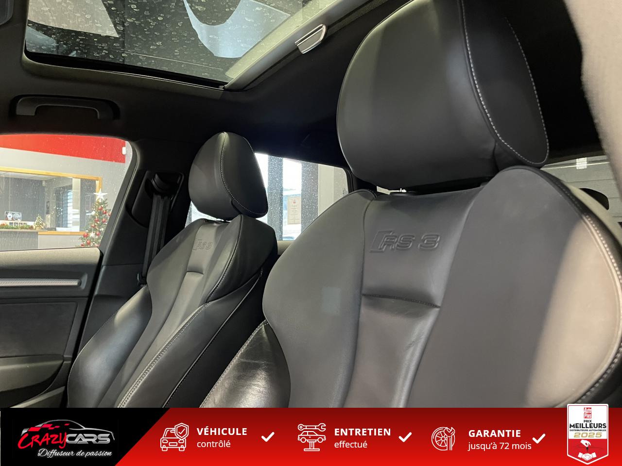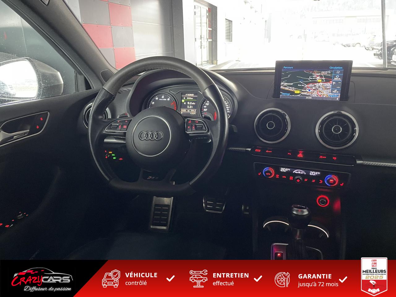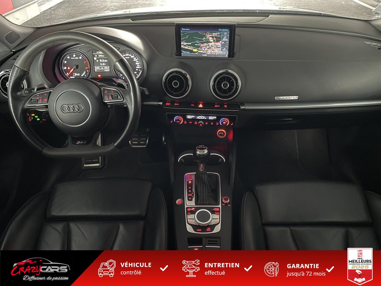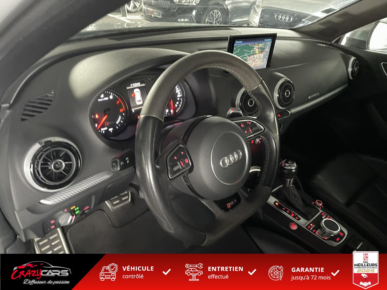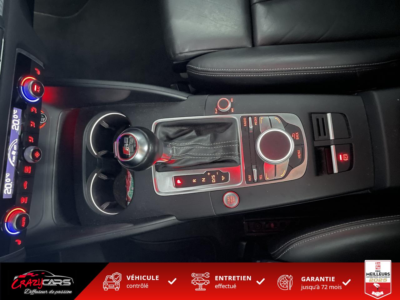 Accoudoir central avant coulissant en longueur, avec vide-poches relevable et inclinaison réglableAdvanced Key : système d'autorisation d'accès et de démarrage main libreAudi Drive Select : différents réglages du véhicule à travers trois modesAudi parking system plus : signal acoustique et visuel d'aide au stationnement avant et arrière par pictogrammes sur l'écranAudi Sound System avec 10 haut-parleursClimatisation automatique Confort avec réglage asservi à la position du soleil, réglage de température gauche/droite séparéEssuie-glace arrière avec déclenchement automatique en marche arrièreFixation pour sièges enfants ISOFIX et Top Tether pour les places arrière extérieuresFrein de stationnement electromécaniqueLève-vitres à l'avant et à l'arrière, électriques, avec protection antipincement, ouverture/fermeture par le verrouillage centralisé, fonction ouverture/fermeture par impulsionLunette arrière dégivrante, avec minuterie; chauffage supplémentaire de l'extrémité inférieure de l'essuie-glace arrièreMMI GPS plus avec données de navigationPack EclairagePréparation pour téléphone portable (Bluetooth), commande sur volant multifonction, mains libres et audiostreamingQuattro : transmission intégrale permanenteRégulateur de vitesse : maintient constante la vitesse souhaitée à partir d'environ 30 km/h dans la mesure où la puissance du moteur ou le frein moteur le permettentRétroviseur intérieur électrochromeRétroviseurs extérieurs style aluminium mat avec rappels de clignotant à diodes, asphérique côté conducteur, convexe côté passager avant, dégivrants et escamotables électriquementS tronic : boîte séquentielle 7 vitesses à double embrayageSeuils de portes avec inserts en aluminium et emblème RS 3Sièges Sport à l'avant en cuir Nappa / Velvet (au niveau des épaules) avec estampillage RS 3 sur le dossier des sièges avantSorties d'échappement RS, visibles et doubles, 2 sorties ovales chromées à gauche et à droiteSystème de freinage avec antiblocage (ABS) et répartiteur électronique de freinage (EBV)Système de ventilation et chauffage 4 diffuseurs d'air rondsVerrouillage centralisé avec télécommande à fréquence radio intégrée à la clé du véhicule et code modifiableVolant réglable en hauteur et en profondeurVolant Sport 3 branches multifonction en cuir badgé RS avec méplat et surpiqûres contrastées (avec palettes de changement de vitesse style aluminium)
