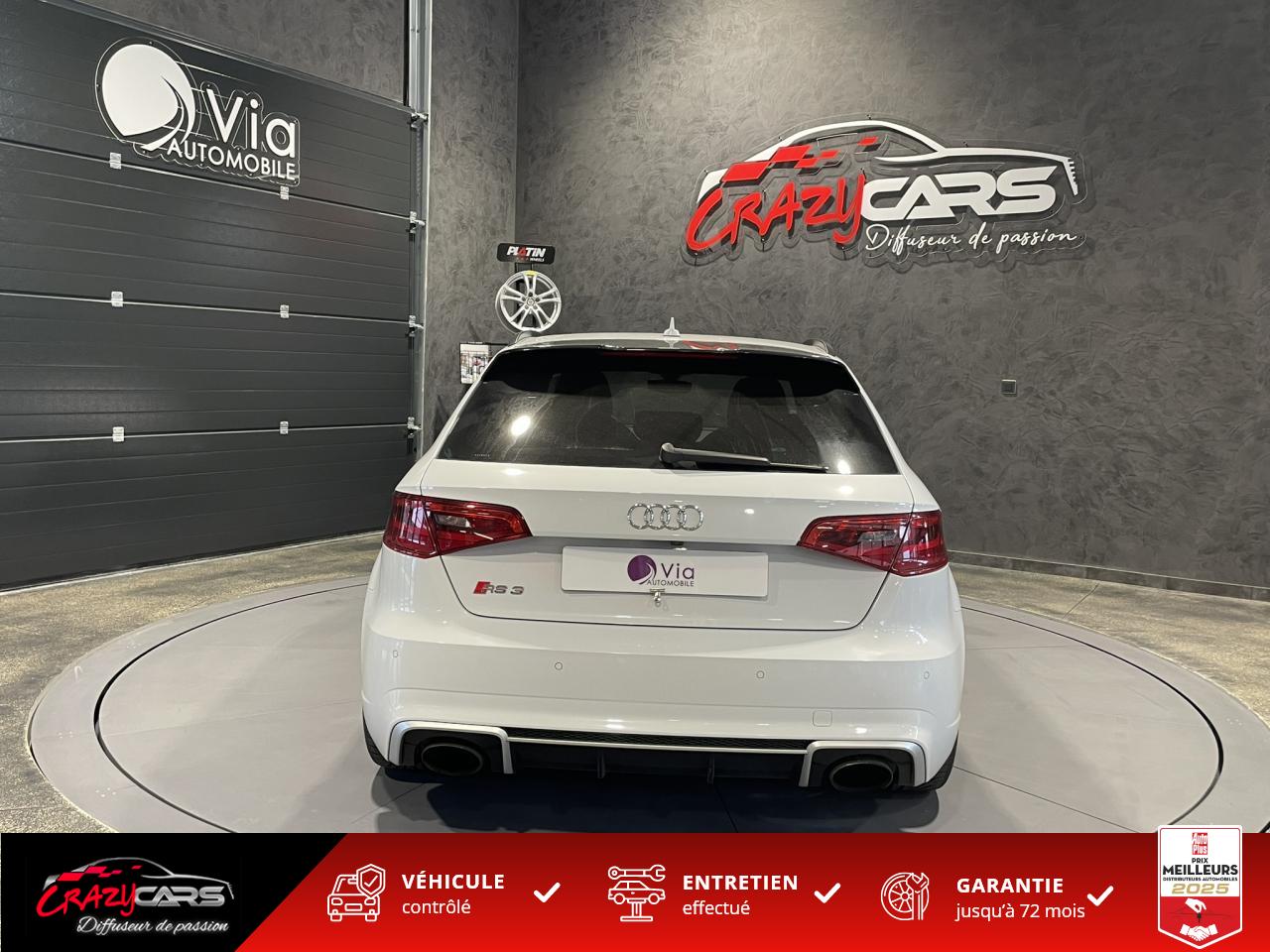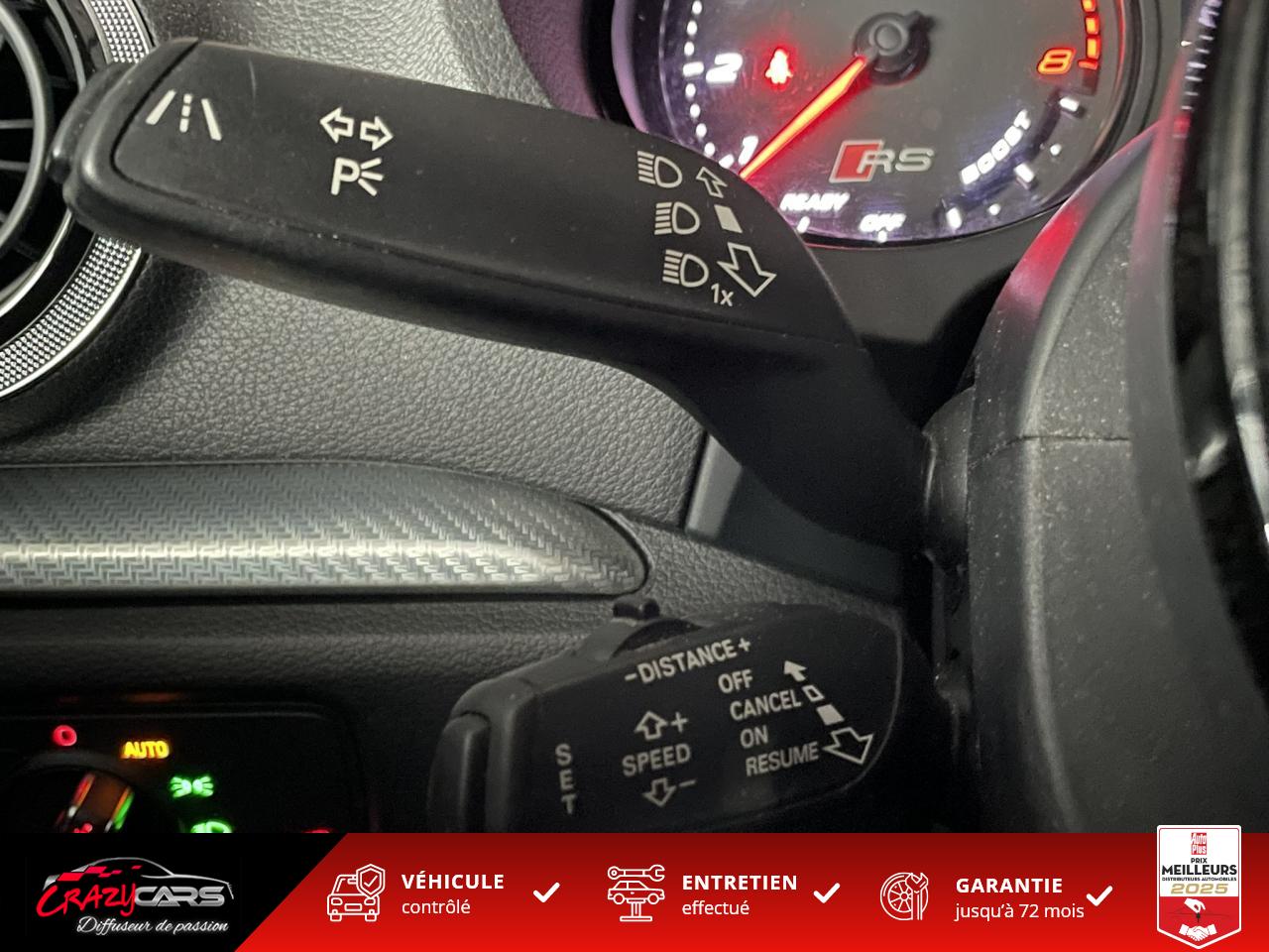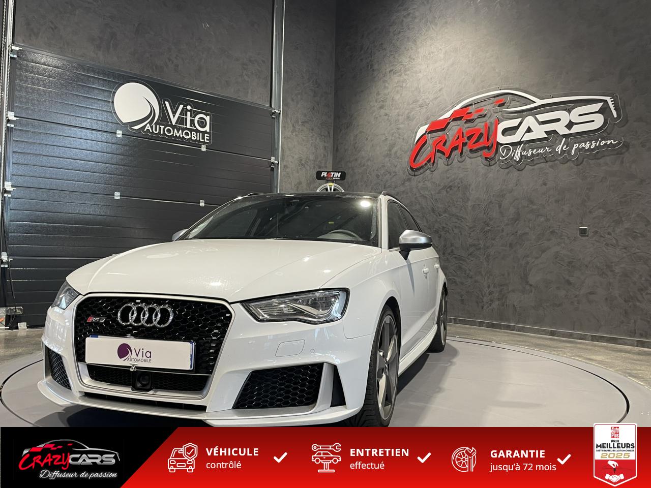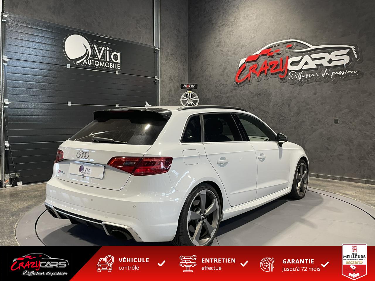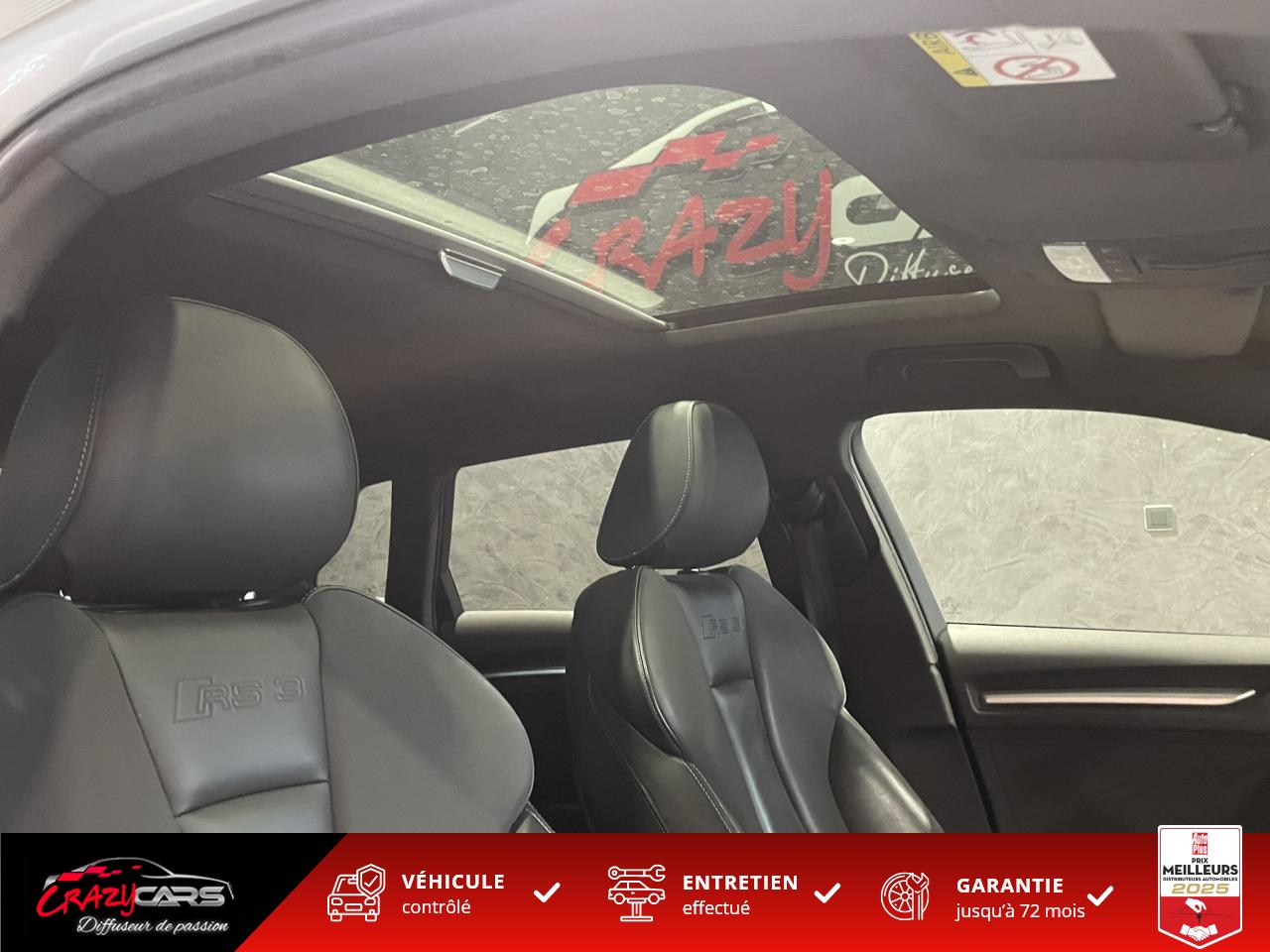 Accoudoir central avant coulissant en longueur, avec vide-poches relevable et inclinaison réglableAdvanced Key : système d'autorisation d'accès et de démarrage main libreAudi Drive Select : différents réglages du véhicule à travers trois modesAudi parking system plus : signal acoustique et visuel d'aide au stationnement avant et arrière par pictogrammes sur l'écranAudi Sound System avec 10 haut-parleursClimatisation automatique Confort avec réglage asservi à la position du soleil, réglage de température gauche/droite séparéEssuie-glace arrière avec déclenchement automatique en marche arrièreFixation pour sièges enfants ISOFIX et Top Tether pour les places arrière extérieuresFrein de stationnement electromécaniqueLève-vitres à l'avant et à l'arrière, électriques, avec protection antipincement, ouverture/fermeture par le verrouillage centralisé, fonction ouverture/fermeture par impulsionLunette arrière dégivrante, avec minuterie; chauffage supplémentaire de l'extrémité inférieure de l'essuie-glace arrièreMMI GPS plus avec données de navigationPack EclairagePréparation pour téléphone portable (Bluetooth), commande sur volant multifonction, mains libres et audiostreamingQuattro : transmission intégrale permanenteRégulateur de vitesse : maintient constante la vitesse souhaitée à partir d'environ 30 km/h dans la mesure où la puissance du moteur ou le frein moteur le permettentRétroviseur intérieur électrochromeRétroviseurs extérieurs style aluminium mat avec rappels de clignotant à diodes, asphérique côté conducteur, convexe côté passager avant, dégivrants et escamotables électriquementS tronic : boîte séquentielle 7 vitesses à double embrayageSeuils de portes avec inserts en aluminium et emblème RS 3Sièges Sport à l'avant en cuir Nappa / Velvet (au niveau des épaules) avec estampillage RS 3 sur le dossier des sièges avantSorties d'échappement RS, visibles et doubles, 2 sorties ovales chromées à gauche et à droiteSystème de freinage avec antiblocage (ABS) et répartiteur électronique de freinage (EBV)Système de ventilation et chauffage 4 diffuseurs d'air rondsVerrouillage centralisé avec télécommande à fréquence radio intégrée à la clé du véhicule et code modifiableVolant réglable en hauteur et en profondeurVolant Sport 3 branches multifonction en cuir badgé RS avec méplat et surpiqûres contrastées (avec palettes de changement de vitesse style aluminium)