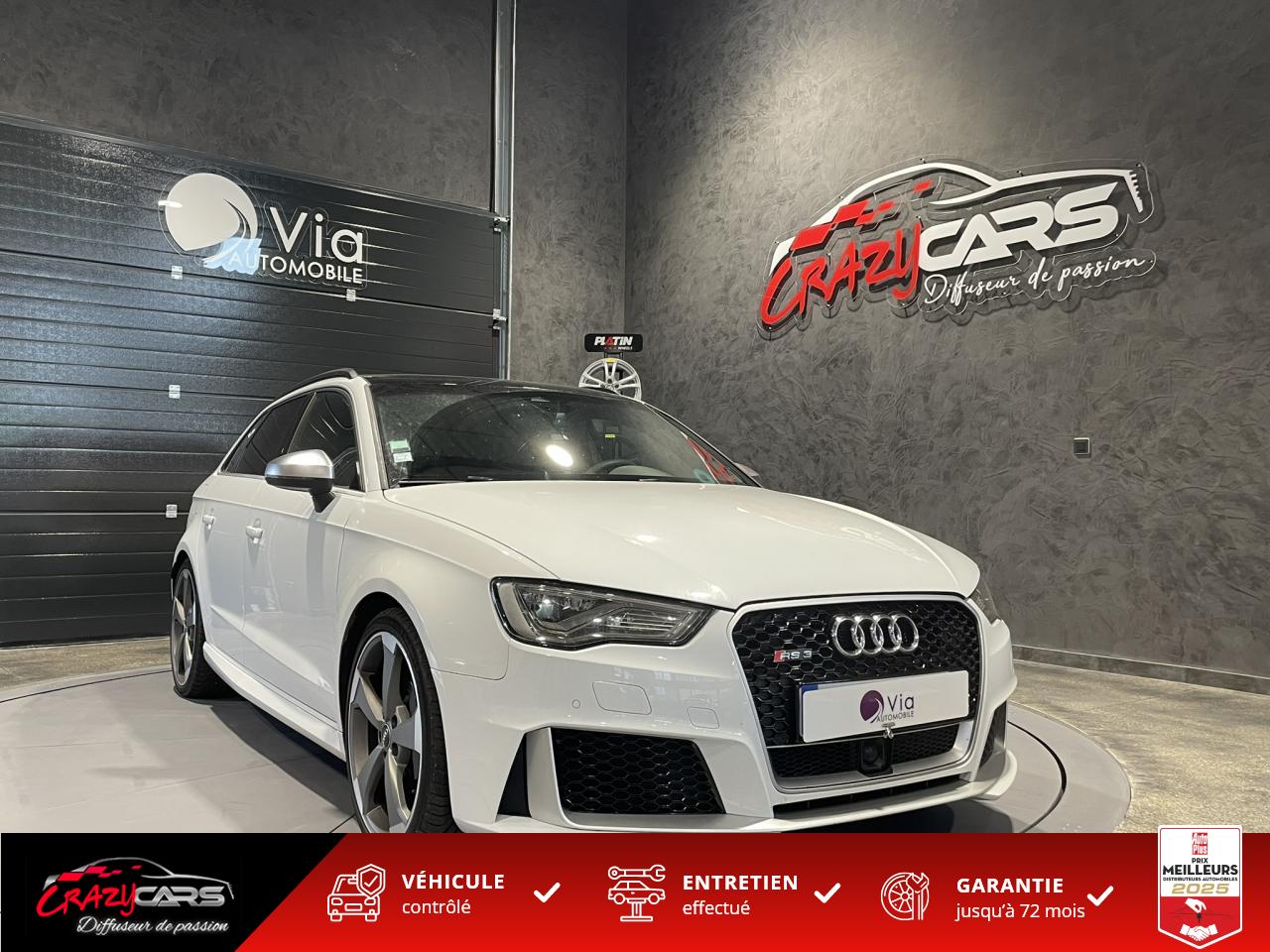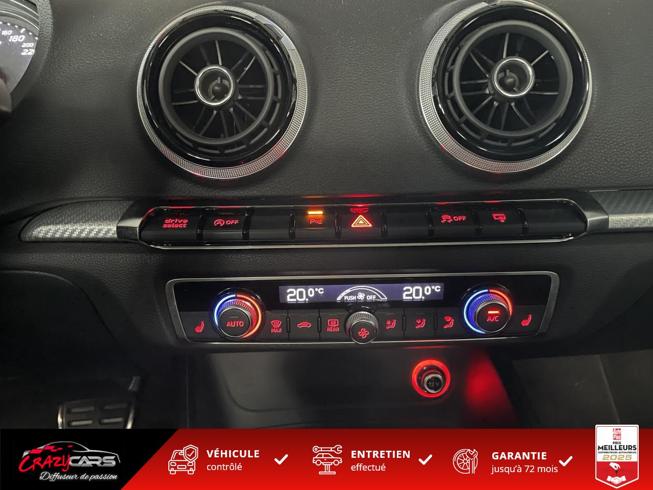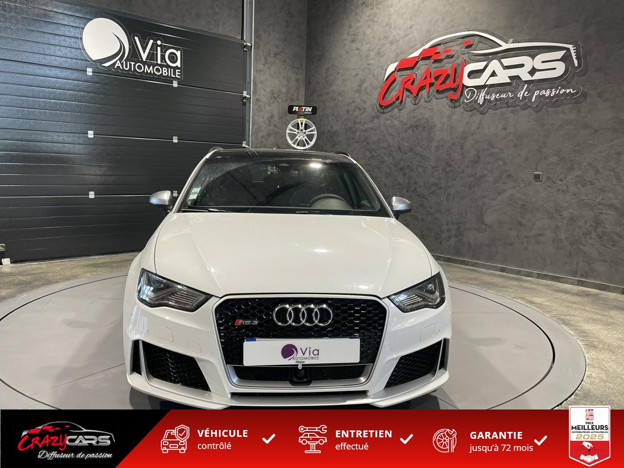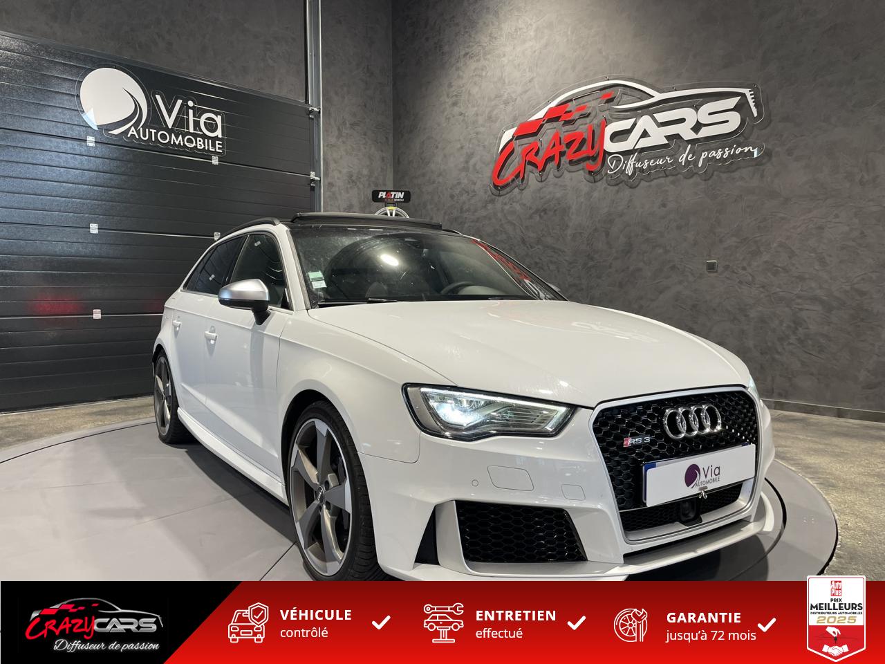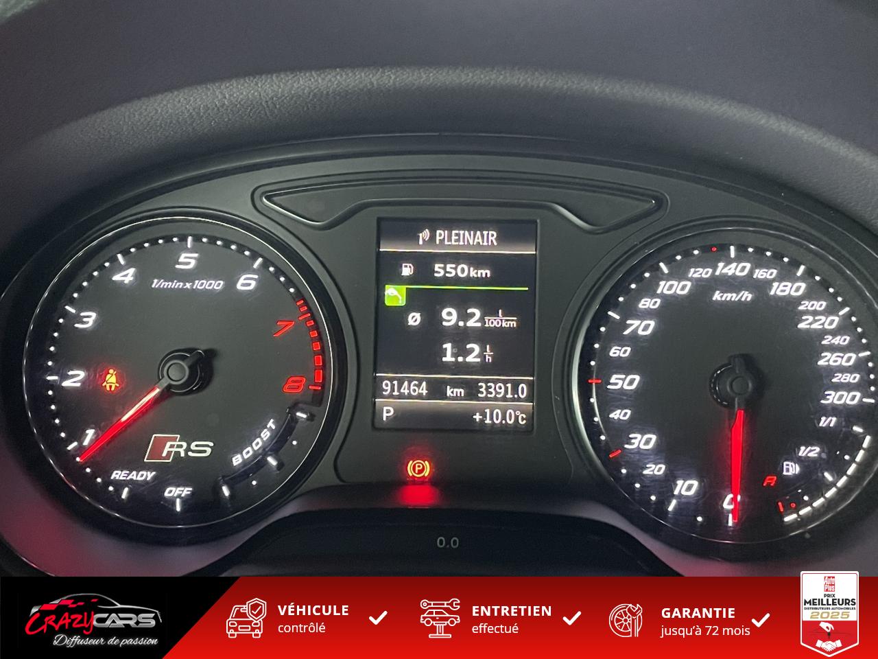 Accoudoir central avant coulissant en longueur, avec vide-poches relevable et inclinaison réglableAdvanced Key : système d'autorisation d'accès et de démarrage main libreAudi Drive Select : différents réglages du véhicule à travers trois modesAudi parking system plus : signal acoustique et visuel d'aide au stationnement avant et arrière par pictogrammes sur l'écranAudi Sound System avec 10 haut-parleursClimatisation automatique Confort avec réglage asservi à la position du soleil, réglage de température gauche/droite séparéEssuie-glace arrière avec déclenchement automatique en marche arrièreFixation pour sièges enfants ISOFIX et Top Tether pour les places arrière extérieuresFrein de stationnement electromécaniqueLève-vitres à l'avant et à l'arrière, électriques, avec protection antipincement, ouverture/fermeture par le verrouillage centralisé, fonction ouverture/fermeture par impulsionLunette arrière dégivrante, avec minuterie; chauffage supplémentaire de l'extrémité inférieure de l'essuie-glace arrièreMMI GPS plus avec données de navigationPack EclairagePréparation pour téléphone portable (Bluetooth), commande sur volant multifonction, mains libres et audiostreamingQuattro : transmission intégrale permanenteRégulateur de vitesse : maintient constante la vitesse souhaitée à partir d'environ 30 km/h dans la mesure où la puissance du moteur ou le frein moteur le permettentRétroviseur intérieur électrochromeRétroviseurs extérieurs style aluminium mat avec rappels de clignotant à diodes, asphérique côté conducteur, convexe côté passager avant, dégivrants et escamotables électriquementS tronic : boîte séquentielle 7 vitesses à double embrayageSeuils de portes avec inserts en aluminium et emblème RS 3Sièges Sport à l'avant en cuir Nappa / Velvet (au niveau des épaules) avec estampillage RS 3 sur le dossier des sièges avantSorties d'échappement RS, visibles et doubles, 2 sorties ovales chromées à gauche et à droiteSystème de freinage avec antiblocage (ABS) et répartiteur électronique de freinage (EBV)Système de ventilation et chauffage 4 diffuseurs d'air rondsVerrouillage centralisé avec télécommande à fréquence radio intégrée à la clé du véhicule et code modifiableVolant réglable en hauteur et en profondeurVolant Sport 3 branches multifonction en cuir badgé RS avec méplat et surpiqûres contrastées (avec palettes de changement de vitesse style aluminium)