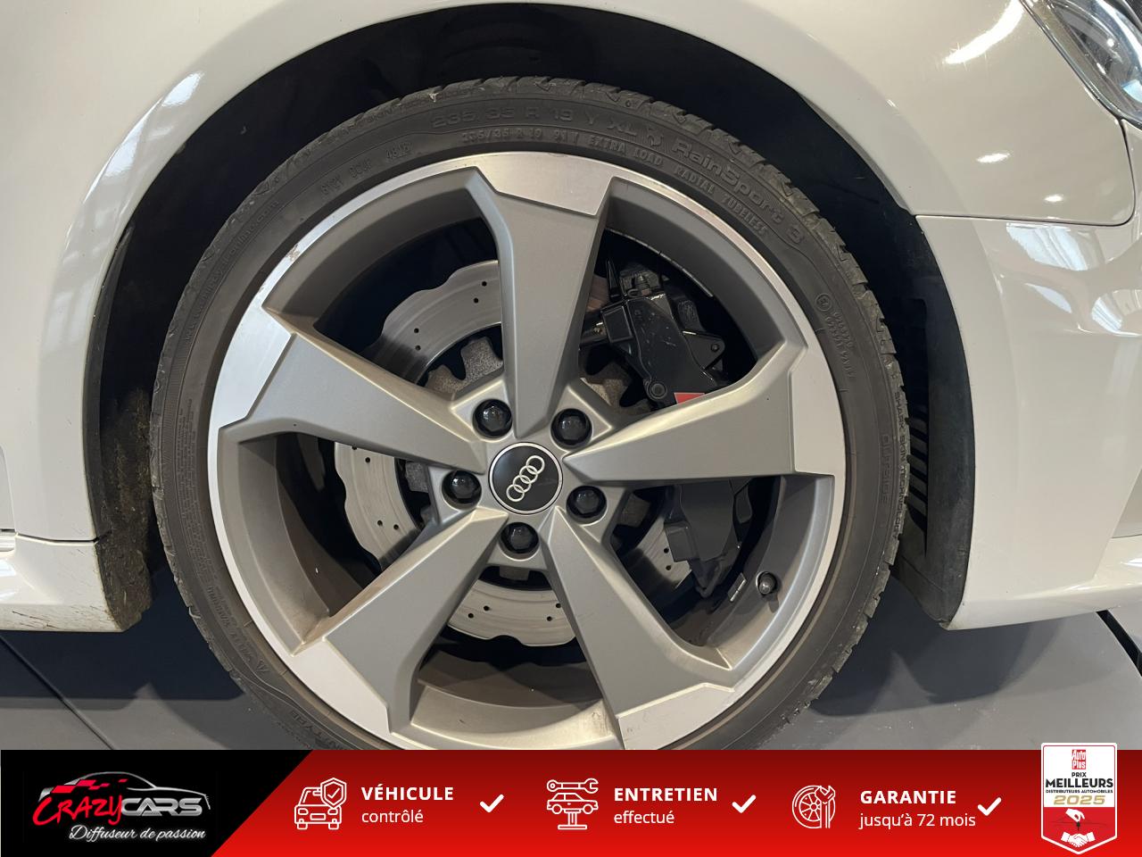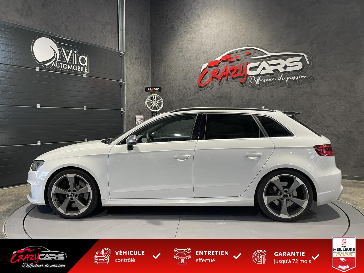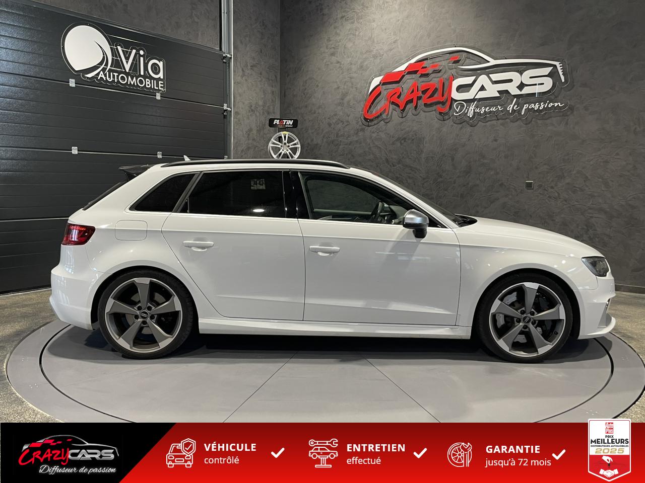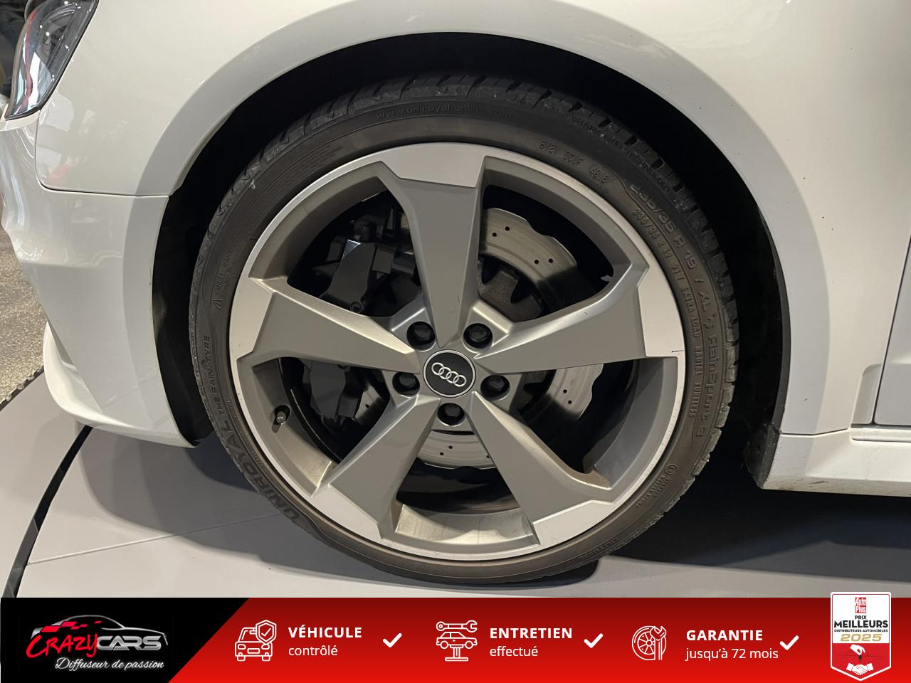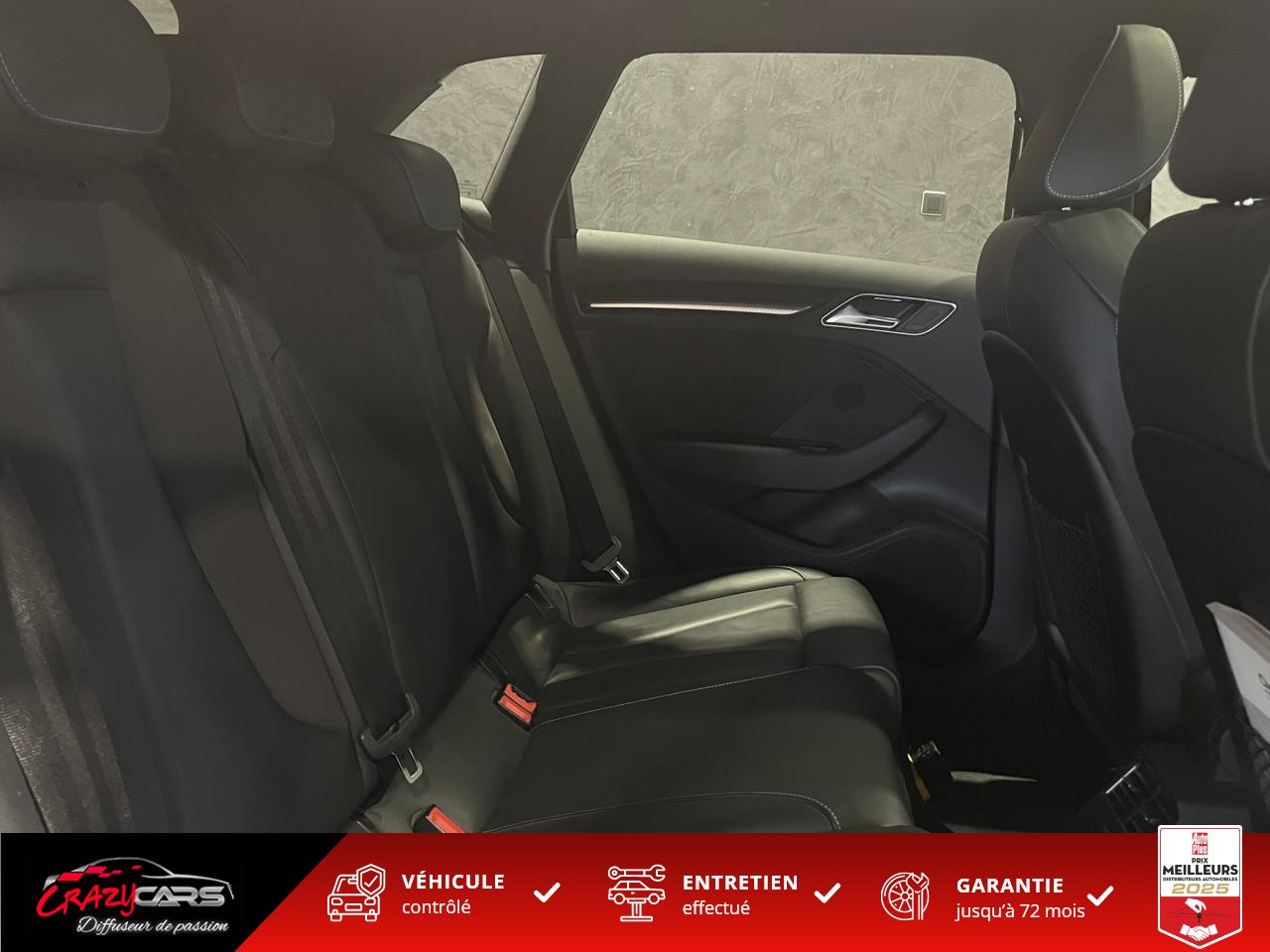 Accoudoir central avant coulissant en longueur, avec vide-poches relevable et inclinaison réglableAdvanced Key : système d'autorisation d'accès et de démarrage main libreAudi Drive Select : différents réglages du véhicule à travers trois modesAudi parking system plus : signal acoustique et visuel d'aide au stationnement avant et arrière par pictogrammes sur l'écranAudi Sound System avec 10 haut-parleursClimatisation automatique Confort avec réglage asservi à la position du soleil, réglage de température gauche/droite séparéEssuie-glace arrière avec déclenchement automatique en marche arrièreFixation pour sièges enfants ISOFIX et Top Tether pour les places arrière extérieuresFrein de stationnement electromécaniqueLève-vitres à l'avant et à l'arrière, électriques, avec protection antipincement, ouverture/fermeture par le verrouillage centralisé, fonction ouverture/fermeture par impulsionLunette arrière dégivrante, avec minuterie; chauffage supplémentaire de l'extrémité inférieure de l'essuie-glace arrièreMMI GPS plus avec données de navigationPack EclairagePréparation pour téléphone portable (Bluetooth), commande sur volant multifonction, mains libres et audiostreamingQuattro : transmission intégrale permanenteRégulateur de vitesse : maintient constante la vitesse souhaitée à partir d'environ 30 km/h dans la mesure où la puissance du moteur ou le frein moteur le permettentRétroviseur intérieur électrochromeRétroviseurs extérieurs style aluminium mat avec rappels de clignotant à diodes, asphérique côté conducteur, convexe côté passager avant, dégivrants et escamotables électriquementS tronic : boîte séquentielle 7 vitesses à double embrayageSeuils de portes avec inserts en aluminium et emblème RS 3Sièges Sport à l'avant en cuir Nappa / Velvet (au niveau des épaules) avec estampillage RS 3 sur le dossier des sièges avantSorties d'échappement RS, visibles et doubles, 2 sorties ovales chromées à gauche et à droiteSystème de freinage avec antiblocage (ABS) et répartiteur électronique de freinage (EBV)Système de ventilation et chauffage 4 diffuseurs d'air rondsVerrouillage centralisé avec télécommande à fréquence radio intégrée à la clé du véhicule et code modifiableVolant réglable en hauteur et en profondeurVolant Sport 3 branches multifonction en cuir badgé RS avec méplat et surpiqûres contrastées (avec palettes de changement de vitesse style aluminium)