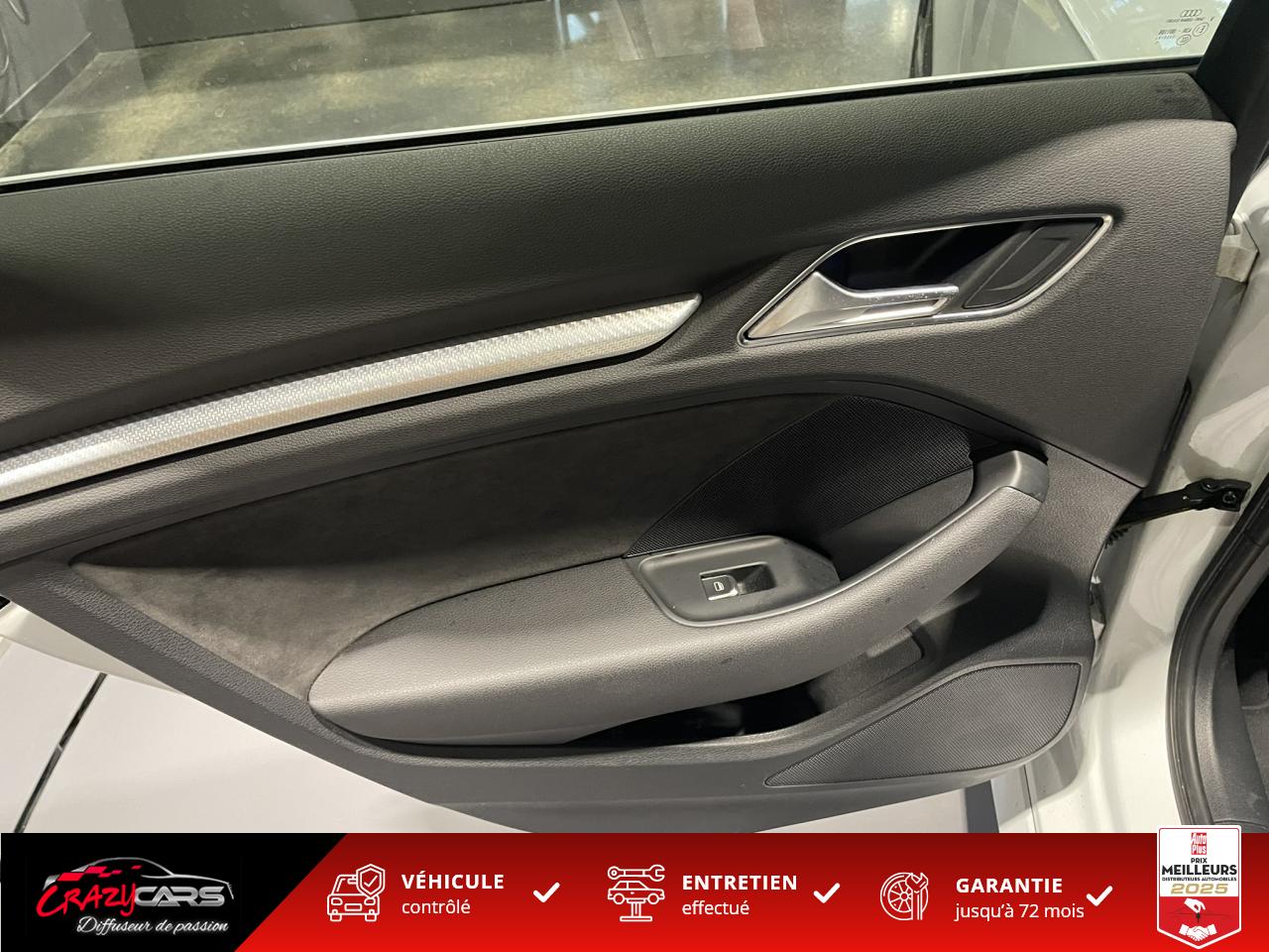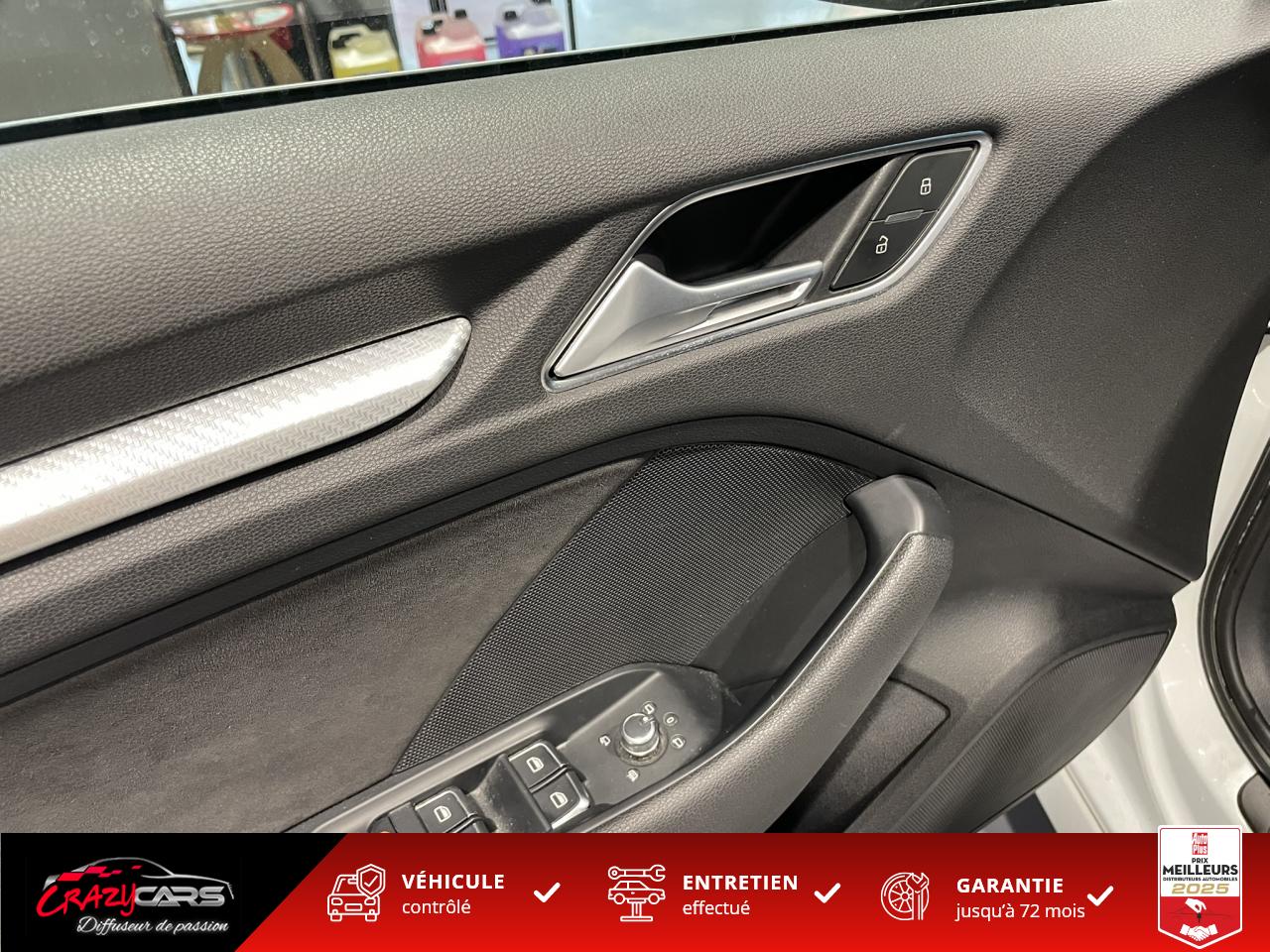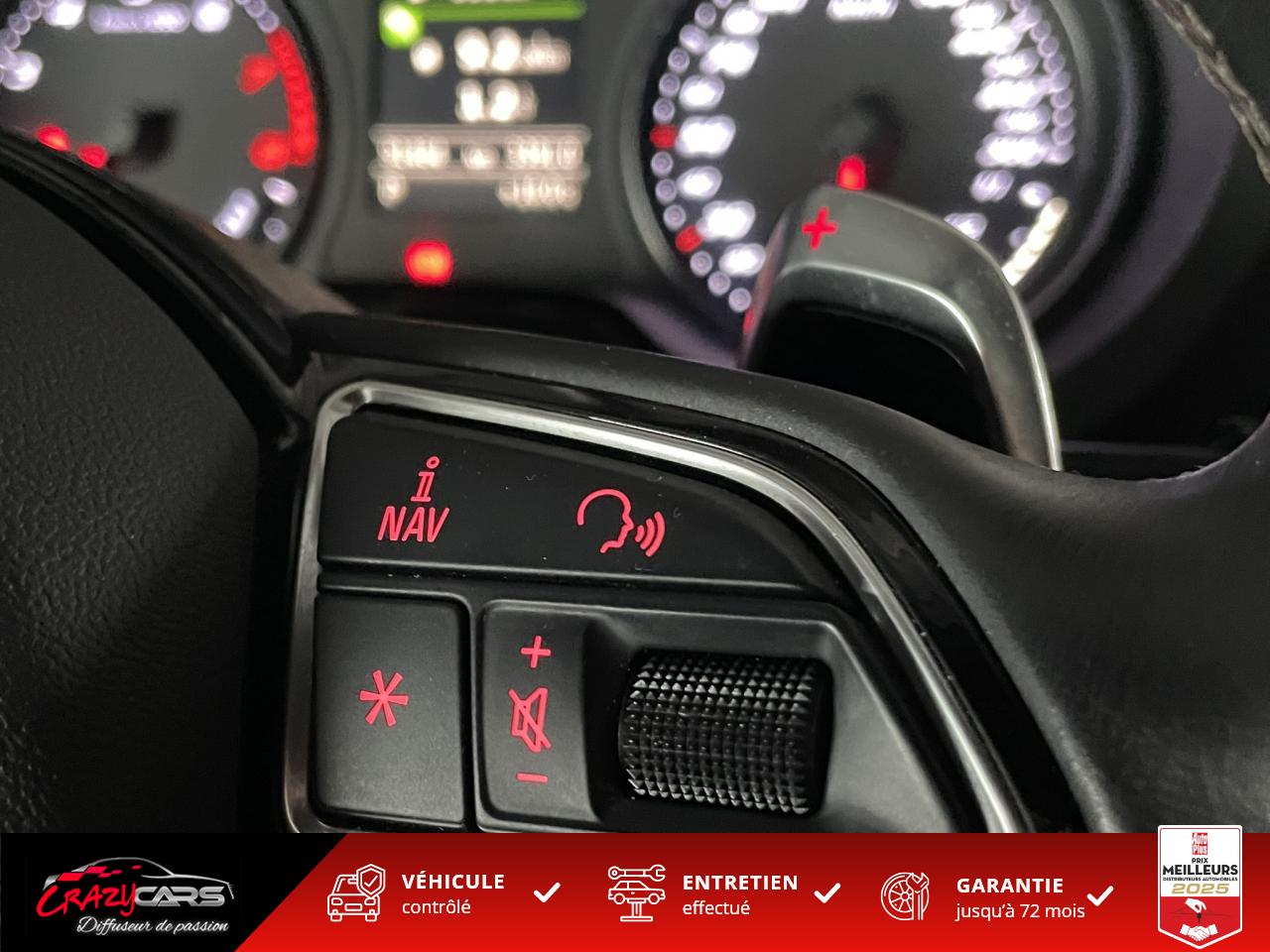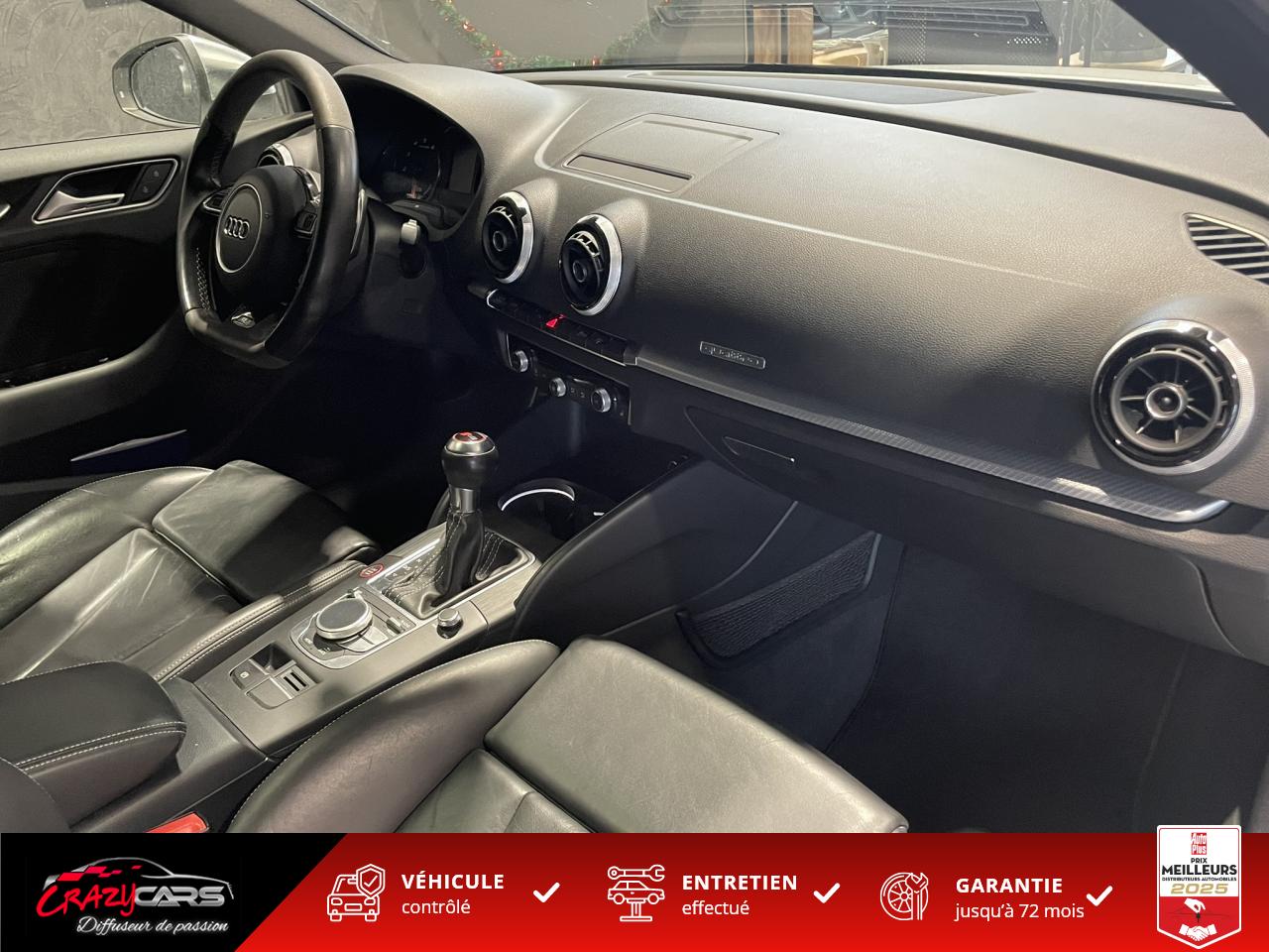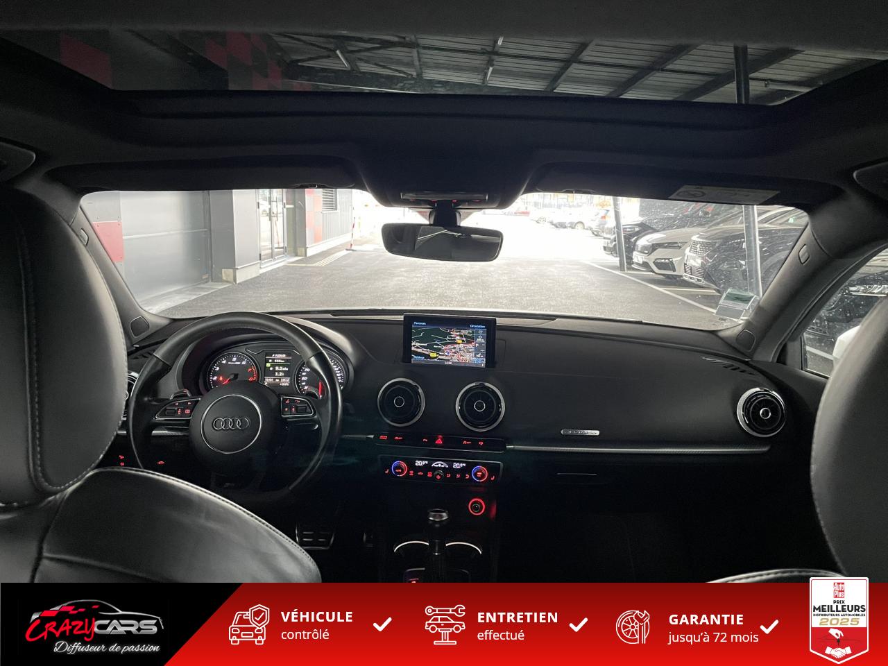Accoudoir central avant coulissant en longueur, avec vide-poches relevable et inclinaison réglableAdvanced Key : système d'autorisation d'accès et de démarrage main libreAudi Drive Select : différents réglages du véhicule à travers trois modesAudi parking system plus : signal acoustique et visuel d'aide au stationnement avant et arrière par pictogrammes sur l'écranAudi Sound System avec 10 haut-parleursClimatisation automatique Confort avec réglage asservi à la position du soleil, réglage de température gauche/droite séparéEssuie-glace arrière avec déclenchement automatique en marche arrièreFixation pour sièges enfants ISOFIX et Top Tether pour les places arrière extérieuresFrein de stationnement electromécaniqueLève-vitres à l'avant et à l'arrière, électriques, avec protection antipincement, ouverture/fermeture par le verrouillage centralisé, fonction ouverture/fermeture par impulsionLunette arrière dégivrante, avec minuterie; chauffage supplémentaire de l'extrémité inférieure de l'essuie-glace arrièreMMI GPS plus avec données de navigationPack EclairagePréparation pour téléphone portable (Bluetooth), commande sur volant multifonction, mains libres et audiostreamingQuattro : transmission intégrale permanenteRégulateur de vitesse : maintient constante la vitesse souhaitée à partir d'environ 30 km/h dans la mesure où la puissance du moteur ou le frein moteur le permettentRétroviseur intérieur électrochromeRétroviseurs extérieurs style aluminium mat avec rappels de clignotant à diodes, asphérique côté conducteur, convexe côté passager avant, dégivrants et escamotables électriquementS tronic : boîte séquentielle 7 vitesses à double embrayageSeuils de portes avec inserts en aluminium et emblème RS 3Sièges Sport à l'avant en cuir Nappa / Velvet (au niveau des épaules) avec estampillage RS 3 sur le dossier des sièges avantSorties d'échappement RS, visibles et doubles, 2 sorties ovales chromées à gauche et à droiteSystème de freinage avec antiblocage (ABS) et répartiteur électronique de freinage (EBV)Système de ventilation et chauffage 4 diffuseurs d'air rondsVerrouillage centralisé avec télécommande à fréquence radio intégrée à la clé du véhicule et code modifiableVolant réglable en hauteur et en profondeurVolant Sport 3 branches multifonction en cuir badgé RS avec méplat et surpiqûres contrastées (avec palettes de changement de vitesse style aluminium)