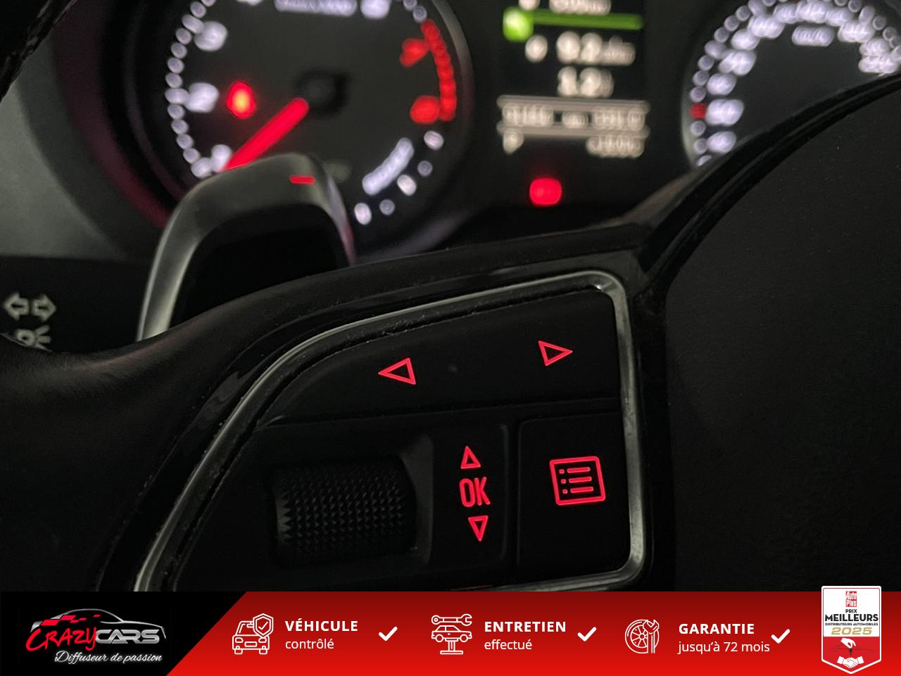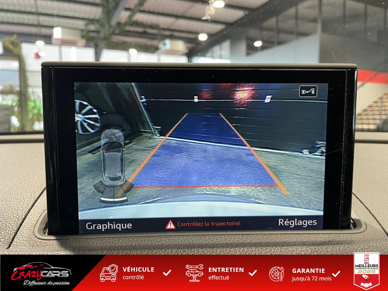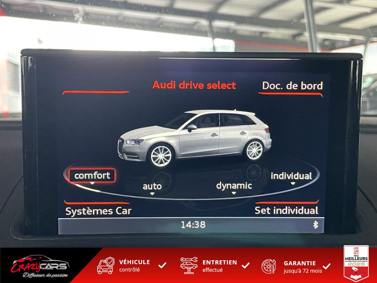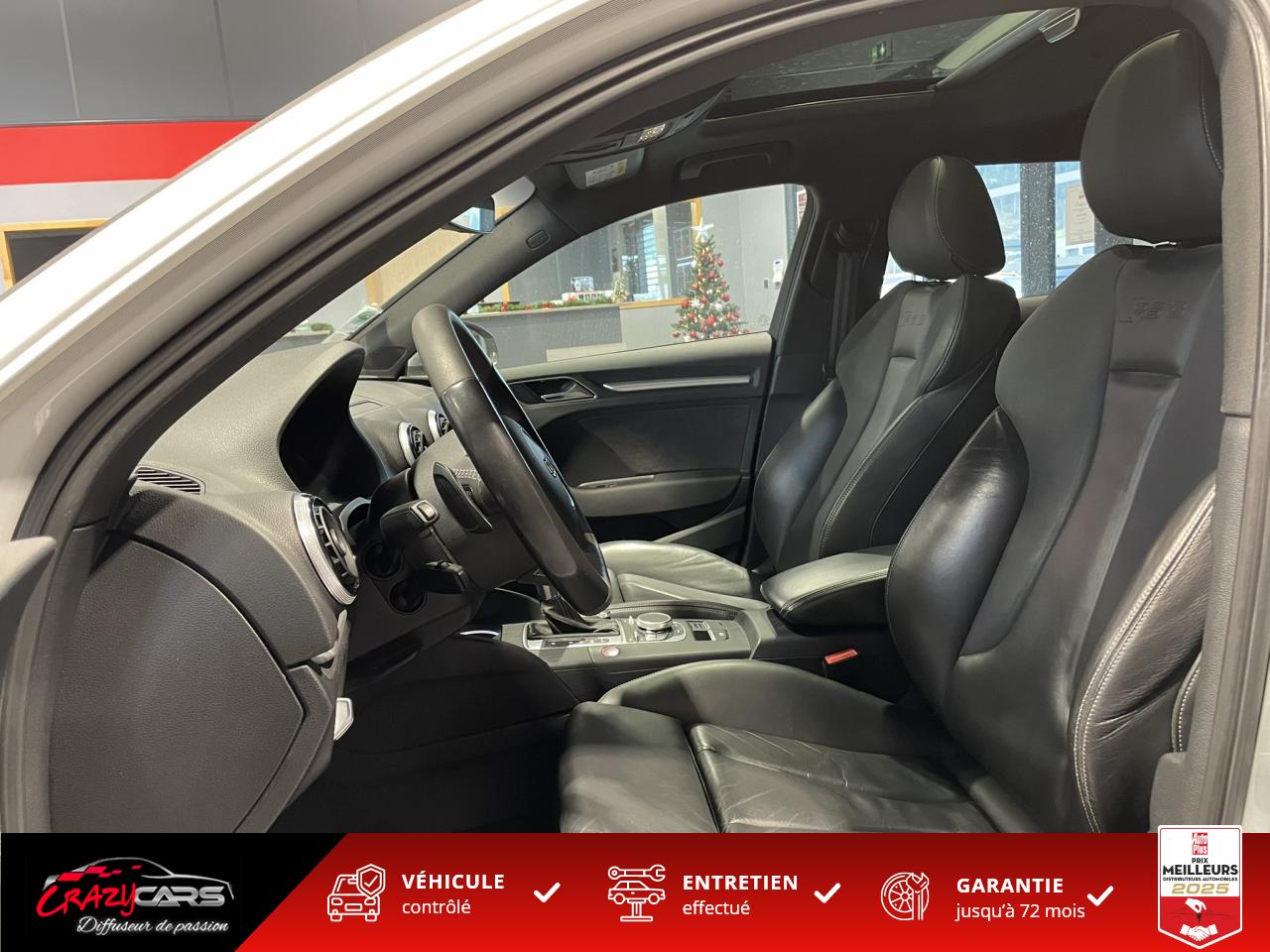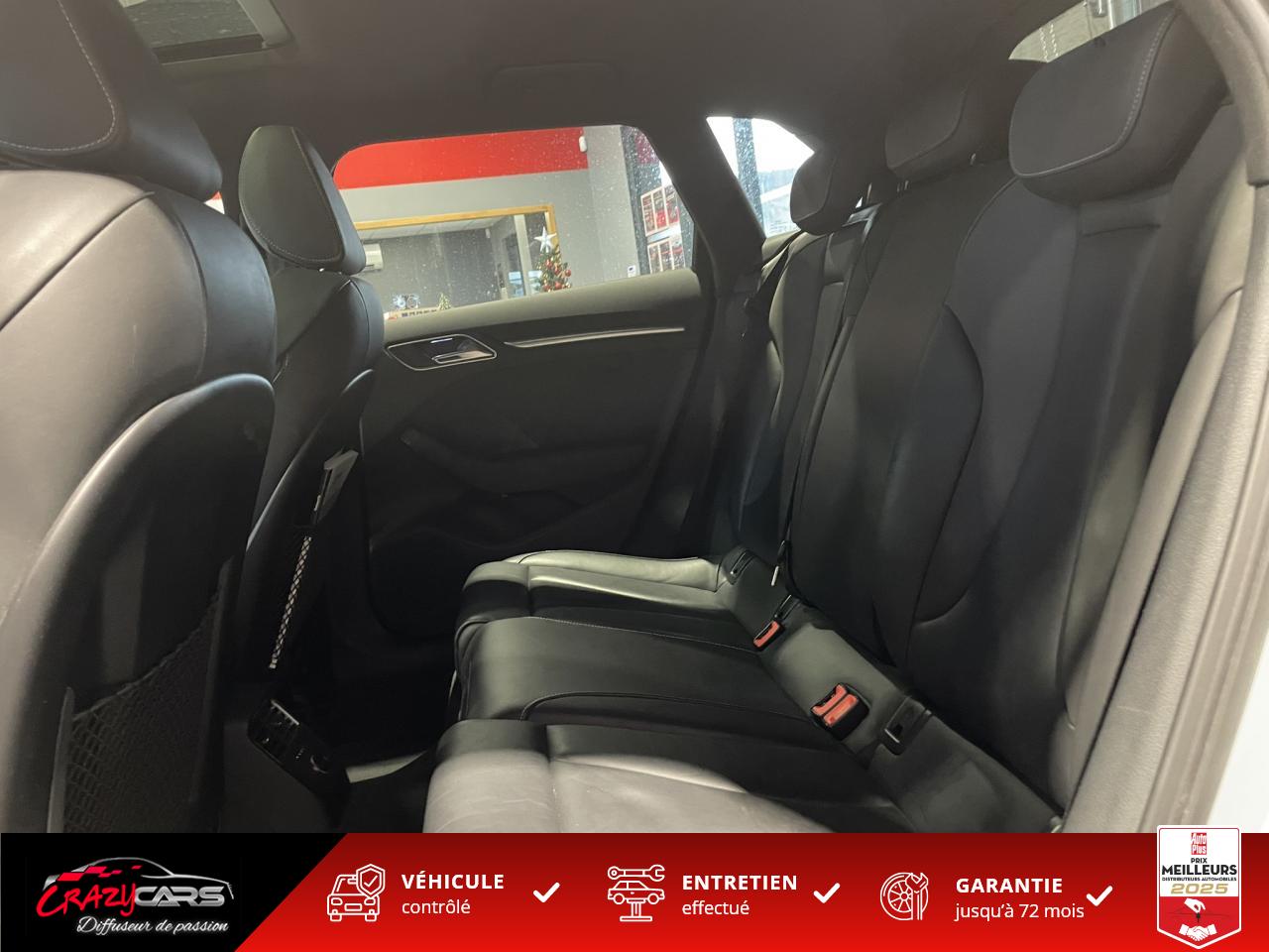 Accoudoir central avant coulissant en longueur, avec vide-poches relevable et inclinaison réglableAdvanced Key : système d'autorisation d'accès et de démarrage main libreAudi Drive Select : différents réglages du véhicule à travers trois modesAudi parking system plus : signal acoustique et visuel d'aide au stationnement avant et arrière par pictogrammes sur l'écranAudi Sound System avec 10 haut-parleursClimatisation automatique Confort avec réglage asservi à la position du soleil, réglage de température gauche/droite séparéEssuie-glace arrière avec déclenchement automatique en marche arrièreFixation pour sièges enfants ISOFIX et Top Tether pour les places arrière extérieuresFrein de stationnement electromécaniqueLève-vitres à l'avant et à l'arrière, électriques, avec protection antipincement, ouverture/fermeture par le verrouillage centralisé, fonction ouverture/fermeture par impulsionLunette arrière dégivrante, avec minuterie; chauffage supplémentaire de l'extrémité inférieure de l'essuie-glace arrièreMMI GPS plus avec données de navigationPack EclairagePréparation pour téléphone portable (Bluetooth), commande sur volant multifonction, mains libres et audiostreamingQuattro : transmission intégrale permanenteRégulateur de vitesse : maintient constante la vitesse souhaitée à partir d'environ 30 km/h dans la mesure où la puissance du moteur ou le frein moteur le permettentRétroviseur intérieur électrochromeRétroviseurs extérieurs style aluminium mat avec rappels de clignotant à diodes, asphérique côté conducteur, convexe côté passager avant, dégivrants et escamotables électriquementS tronic : boîte séquentielle 7 vitesses à double embrayageSeuils de portes avec inserts en aluminium et emblème RS 3Sièges Sport à l'avant en cuir Nappa / Velvet (au niveau des épaules) avec estampillage RS 3 sur le dossier des sièges avantSorties d'échappement RS, visibles et doubles, 2 sorties ovales chromées à gauche et à droiteSystème de freinage avec antiblocage (ABS) et répartiteur électronique de freinage (EBV)Système de ventilation et chauffage 4 diffuseurs d'air rondsVerrouillage centralisé avec télécommande à fréquence radio intégrée à la clé du véhicule et code modifiableVolant réglable en hauteur et en profondeurVolant Sport 3 branches multifonction en cuir badgé RS avec méplat et surpiqûres contrastées (avec palettes de changement de vitesse style aluminium)