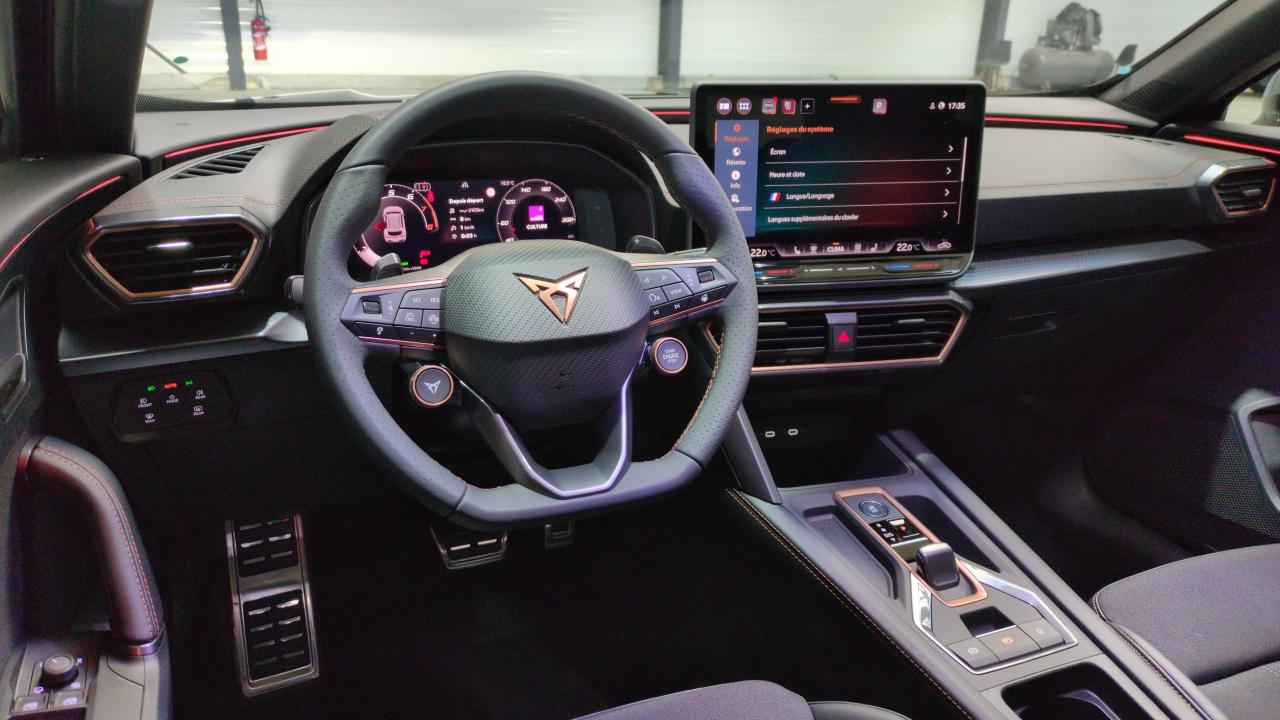 25"9" et touches de commandes tactiles rétro- éclairéesAbsAccès et démarrage mains-libresAccoudoir central av réglable en hauteur et profondeurAide au maintien dans la voie (lane assist)Aide au stationnement av/arAirbags latérauxAlarme antivol avec dispositif de surveillance de l'habitacleAssistant d'intersection (cross traffic assist)Avec palettes de changement de rapportAvec signature lumineuse tri-led et cérémonie de bienvenueBandeau ar ''infinite light'' intégrant le logo cupra lumineuxBoîte de vitesse séquentielleCaméra de reculCapteur de pluie et de luminositéChauffantCiel de pavillon noirClimatisation automatique tri-zone "climatronic"Connectivité 4x usb-c et bluetoothConnectivity box - amplification du signal et chargeur à inductionContrôle de la traction (tcs)Couleur contrastante noir obsidien (bas de caissesCrochet d'attelage escamotable électriquement Design intérieur pure - sièges bimatière textile et tep noir asphalte - planche de bord noire surpiquée avec inserts dark alu - contre-portes en tep noir surpiqués - sièges conducteur et passager avec réglage manuel en hauteur et lombaireDétection de fatigue et somnolenceDiffuseurDigital cockpit 10Direction dynamiqueDossiers ar rabattables 2/3 - 1/3 et trappe à skisDouble sortie d'échappement noire styliséeEclairage de bienvenue avec projection du logo cupra au sol et éclairage d'accompagnementélargisseurs d'ailes et coques de rétroviseurs)Entourage de vitres et rails de toit noir pianoEntrées d'air avFeux de route intelligents (light assist)Fixations isofix avec top-tether à l'arFront assist avec détection des piétons et des cyclistesFull link sans fil ( android auto + apple carplay)Garantie supplémentaire (2+3) ou 100 000 kmsHayon électrique mains-libres ''virtual pedal''Jantes alliage 18" tempestPeinture métallisée noir minuitProjecteurs anti-brouillard Projecteurs full led avec signature lumineusetri-ledRadio numérique dabRégulateur de vitesse adaptatif accRétroviseur intérieur électrochromeRétroviseurs extérieurs électriques et dégivrantsRétroviseurs extérieurs rabattables électriquement Rideaux et centralSeuils de porte cupra rétro-éclairésSièges av chauffantsSign assist - reconnaissance des panneaux de signalisationSmart ambient light (éclairage d'ambiance intérieur intelligent)Système audio à 6 hp avec contrôle vocalSystème d'info-divertissement avec écran tactile hd 12Système de contrôle de la pression des pneusVitres ar surteintéesVitres électriques avVolant supersports cupra en cuir avec boutons satellites