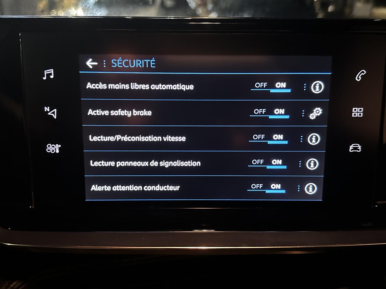 2 prises USB (Recharge type A) sur console basse pour passagers arrièreABS (Antiblocage de roues)AFU (Assistance au freinage d'urgence), REF (Répartiteur Electronique de Freinage)Aide graphique et sonore au stationnement arrièreAirbags frontaux, latéraux AV et rideauxAlarme de non bouclage des ceintures de sécurité avantAlerte de non-bouclage des ceintures à l'arrièreAllumage automatique des feux de croisementAppuie-tête avant et arrière (aux 3 places) réglables en hauteurBandeau entre feux arrière noir brillantBanquette AR rabattable 1/3-2/3Boîtiers de rétroviseurs extérieurs noir brillantCalandre avec grille supérieure avec marquage chrome brillant et enjoliveur supérieur noir grainéClimatisation automatique monozoneConsole haute avec accoudoir intégréContrôle Dynamique de stabilité (DSC)Détecteur de sous-gonflage indirectDirection assistée électriqueEclairage intérieur à ampoules : plafonnier avant à 3 spots (1 lampe et 2 liseuses)Essuie vitre avant à déclenchement automatiqueFeux arrière LEDFixations ISOFIX Top Tether pour les places latérales arrièreFonction 'Mirror Screen' (Apple Carplay / Android Auto)Fonction BluetoothFrein de stationnement électrique avec aide au démarrage en pente et serrage automatiqueHabitacle et ciel de pavillon gris clairJantes alliage 16'' SOHO diamantées peintes Gris StormJupes de pare-chocs arrière inférieure Noir grainée et supérieure Noir brillantPlanche de bord slush et panneaux de portes avant avec décors aspect carboneProjecteurs 'Peugeot LED Technology' avec feux diurnes à LED sous projecteursRégulateur et limiteur de vitesseRétroviseur intérieur électrochromeRétroviseurs extérieurs à réglages électriques, dégivrants et rabattables électriquementSellerie Tri matière Tissu / TEP COSY , surpiqûres Vert MintSiège conducteur avec réglage manuel en hauteurVitres latérales arrière et lunette arrière chauffante temporisée surteintéesVolant compact croute de cuir, Lion chromé et commandes multimédia sur volantVolant réglable en hauteur et en profondeurRoue de secours en acier de taille normale avec cric et outillage
