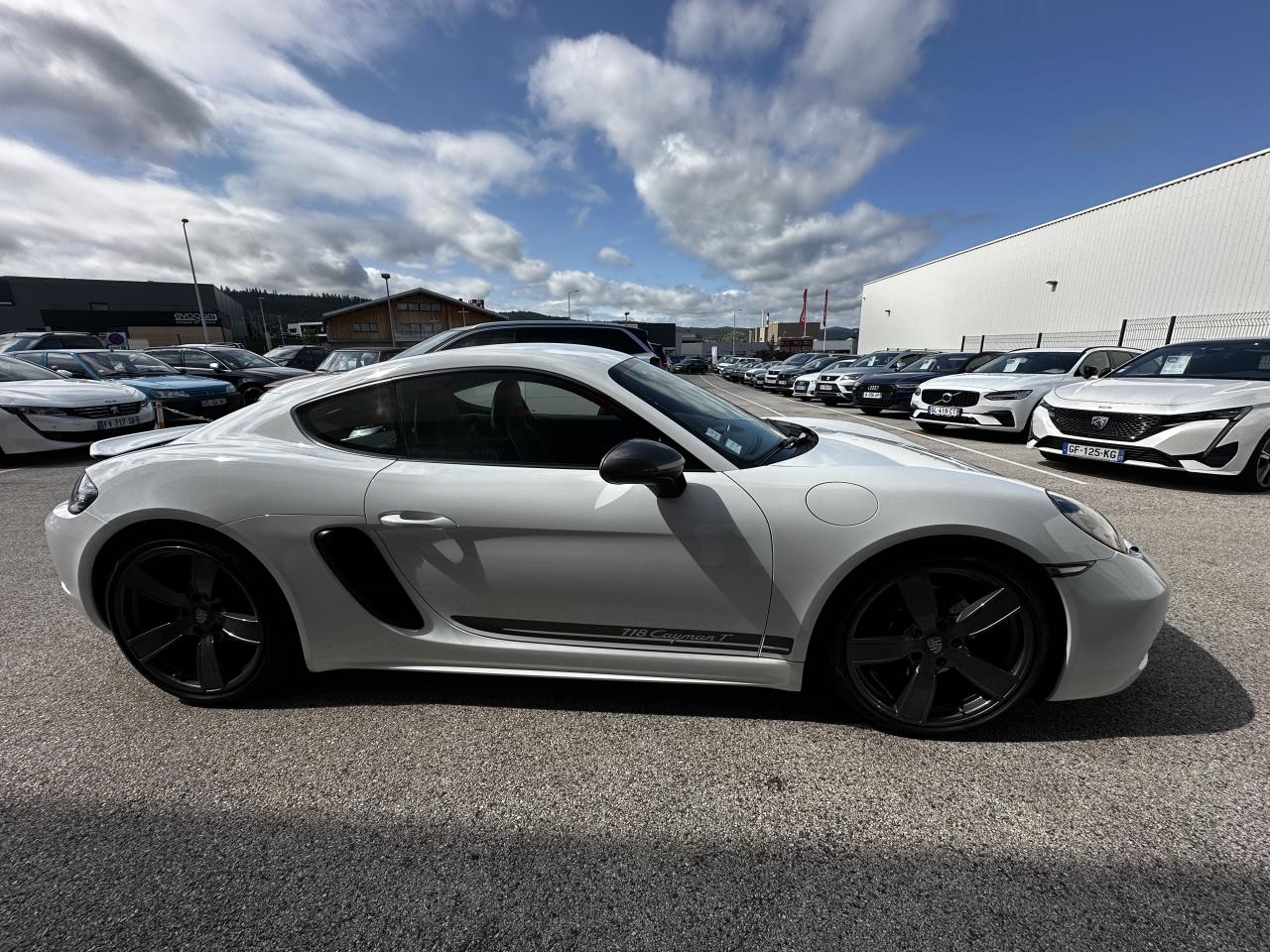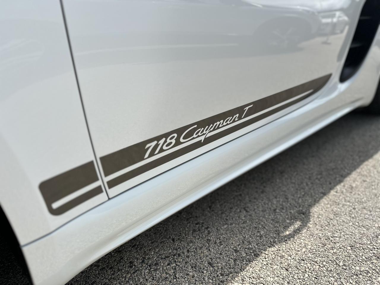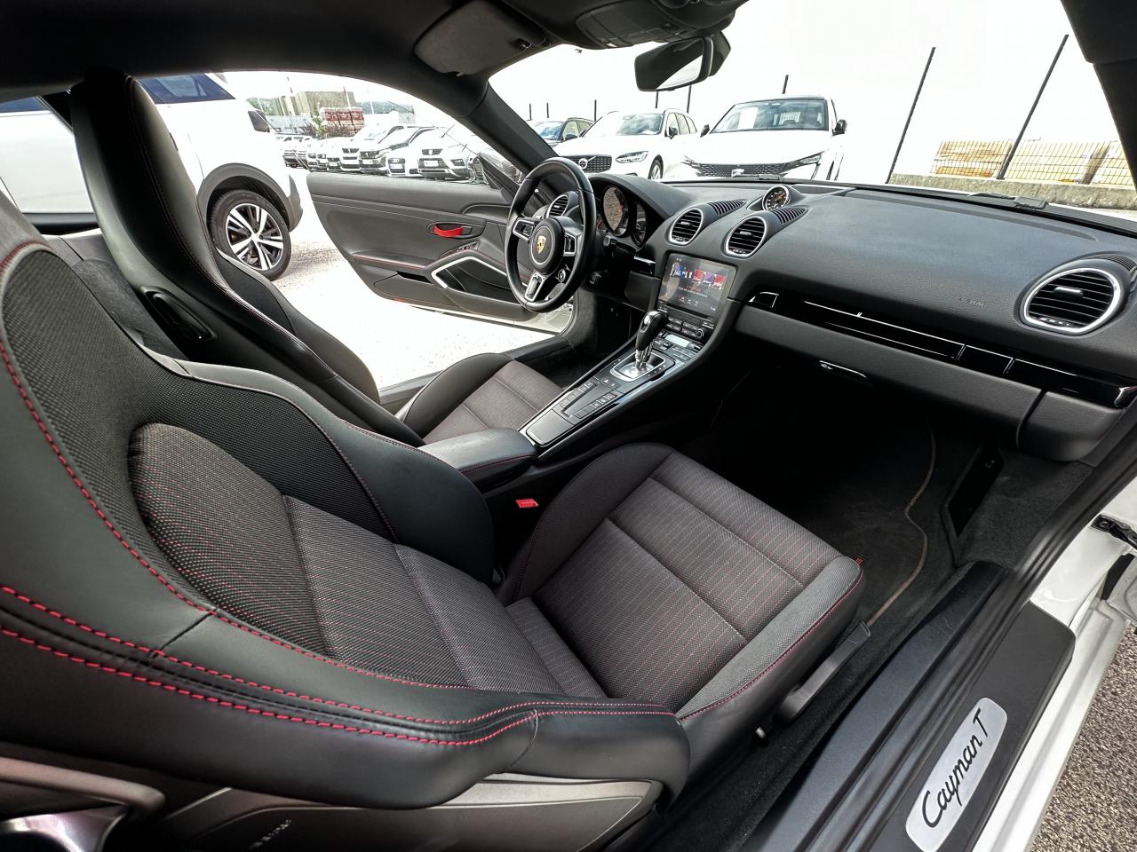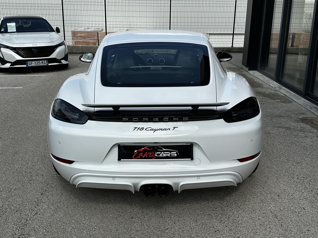 1 turbocompresseur, 1 échangeur thermiqueAccoudoirs de portes et couvercle du coffre de rangement de la console centrale avec revêtement en Cuir lisseAffichage des performances sur le PCMAffichage numérique : vitesse, rapport engagé, kilométrages total et journalierAileron arrière à déploiement automatiqueAirbags grand volume pour le conducteur et le passagerAllumage automatique des feux en cas d'ouverture/fermeture du véhiculeApplication Porsche Track PrecisionBaguettes de seuil de porte avec logo Cayman TBaguettes décoratives du tableau de bord en Noir brillantBande centrale des sièges en Sport-Tex, bandes latérales des sièges avant et appuie-tête revêtus de CuirBloc moteur et culasse en aluminiumBloc optique supplémentaire à DEL dans le bouclier avant avec feux de position, clignotants et rappels de clignotant latérauxBoîte de vitesse Porsche Doppelkupplung (PDK)Bouclier avant avec entrées d'air intégréesCadrans du combiné d’instruments, compte-tours avec logo Cayman T en BlancCatalyseur à 3 voies et diagnostic embarqué dédié à la surveillance du système de dépollutionCiel de toit en tissu noirCoffre à l’avant et à l’arrièreCombiné d'instruments avec compte-tours central et écran couleur haute définition de 4,6 poucesConcept de véhicule deux places avec moteur centralConsole centrale montante avec un vide-poche ouvert et un autre ferméContrôle de pression des pneus ( TPMS )Coque de rétroviseurs extérieurs avec éléments peints en Gris QuartzCouronne de volant, levier de vitesses et insert de la poignée de porte avec revêtement en Cuir lisseCrochets porte-vêtement au dos des siègesDégivrage de la lunette arrièreDirection assistée électromécanique à démultiplication variable et impulsionDisques : ventilés et ajourés à l'avant et à l'arrière, 330 mm de diamètre à l'avant et 299 mm à l'arrière"Double débrayage dynamique lors du passage à la vitesse inférieure en mode SPORT et SPORT PLUSEcrous de roues antivolEssieu à jambes de force allégées à l’avant et à l’arrièreEssuie-glaces avec buse de lave-glace intégréeEtriers de freins noirsEtriers fixes monoblocs en aluminium à 4 pistons à l'avant et à l'arrièreFeux arrière à DEL avec feux stop intégrés 4 points et feux de reculFonction Stop-Start automatique et mode CroisièreFrein de parking électroniqueInjection directe d'essenceInscription décorative latérale « 718 Cayman T » en Gris QuartzInserts décoratifs de la console centrale en Noir brillantJantes "Carrera S" 20 poucesJantes en Gris Titane brillanteKit anticrevaison TIREFIT avec compresseur électriqueLève-vitre électrique avec fonction à impulsion haut/bas et abaissement automatique de la vitreLogo 718 brodé en Noir sur les appuie-têteLubrification intégrée à carter sec avec pompe à huile à débit piloté en fonction des besoinsMode SPORT PLUS avec réglage axé sur les performances pour le moteur, la boîte de vitesse et le châssisPack Audio PlusPack Sport ChronoPalettes de changement de rapportPhares bi-xénon avec éclairage jour à DELPorsche Side Impact Protection System (POSIP) comprenant une protection anti-encastrement latérale installée dans les portières, des airbags thorax logés dans les bandes latérales des sièges et des airbags de tête intégrés aux panneaux dePorsche Stability Management (PSM), ABS inclus, avec fonctions de freinage avancéesPorsche Torque Vectoring (PTV)Prise 12 V dans la console centralePrise de courant (12 V) dans le plancher côté passagerRangement dans la console centraleRefroidissement par eau avec module de gestion thermiqueRéglage manuel du volant en hauteur et en profondeurRétroviseur extérieur sur panneau de porte, chauffant, réglable électriquement, asphérique côté conducteurSangle d’ouverture des portes en NoirSélecteur de modes de conduite (Normal, Sport, Sport Plus et individual)Services Porsche Vehicle Tracking System (PVTS) permet l'accès aux services de commande liés au véhicule, à travers les services Porsche Car ConnectSièges sport Plus (2 réglages, électrique) avec coque des dossiers peinte en Gris ArgentSignature « PORSCHE » sur baguette décorative et désignation du modèle sur le bouclier arrière, en Argent brillantSpots de lecture, éclairage d’orientation et de démarreur à DEL, ainsi qu’éclairage du coffre et de la boîte à gantsStructure légère intelligente combinant l’aluminium et l’acierSuspension abaissée de 20mm avec PASMSystème antidémarrage avec verrouillage centralisé et télécommandeSystème d'alarmeSystème d’échappement Sport avec double sortie centrale en Acier spécial Noir (finition brillante)Technologie 4 soupapesTeinte Intérieur NoirTeintes extérieures unies : Blanc, Noir, Rouge Indien, Jaune Porsche RacingVarioCam Plus avec calage variable des arbres à cames et de la levée des soupapesVentilation avec commande de recyclage d’air et de dégivrageVitres athermiques teintées vertes