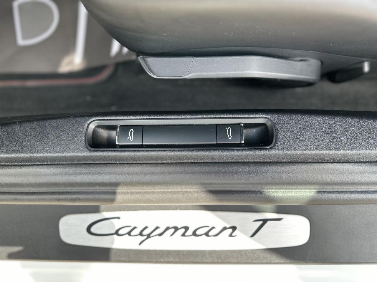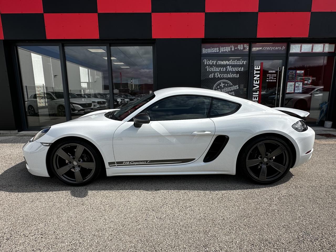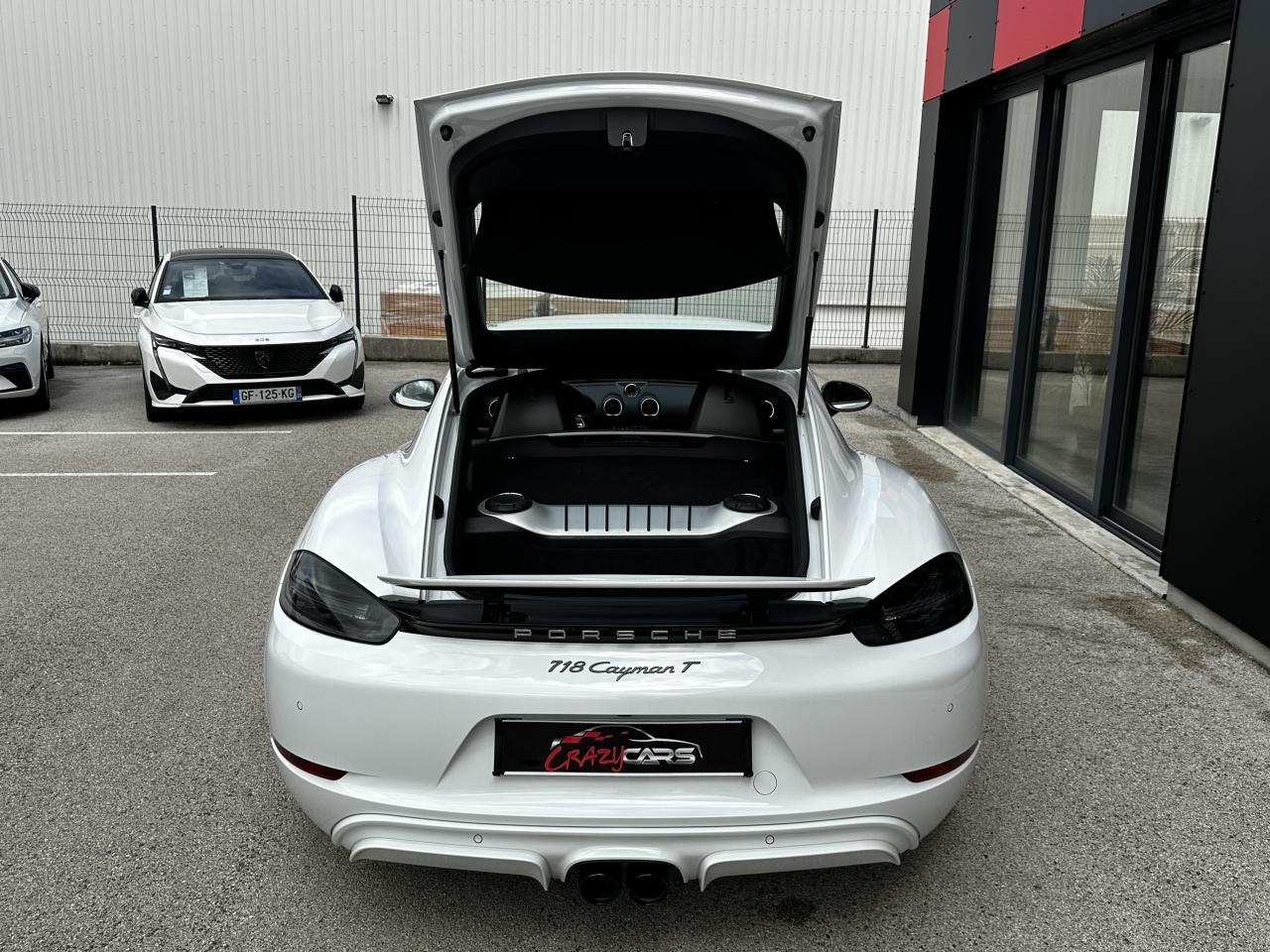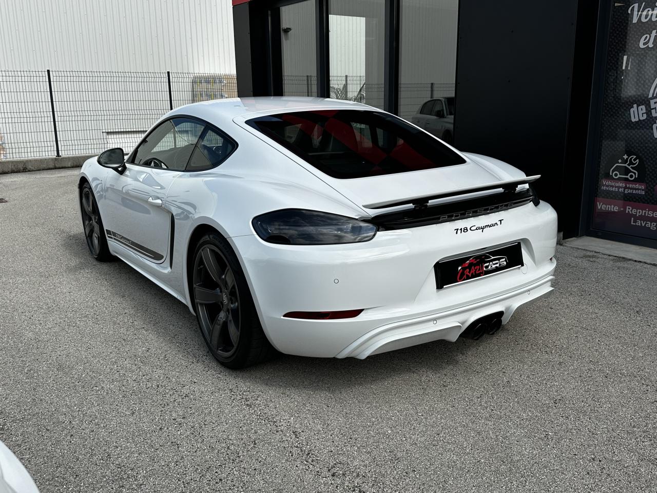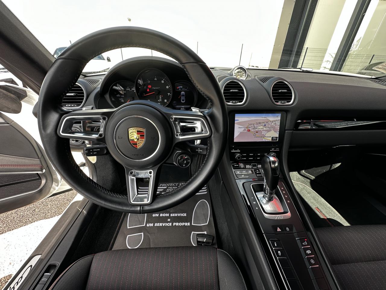 1 turbocompresseur, 1 échangeur thermiqueAccoudoirs de portes et couvercle du coffre de rangement de la console centrale avec revêtement en Cuir lisseAffichage des performances sur le PCMAffichage numérique : vitesse, rapport engagé, kilométrages total et journalierAileron arrière à déploiement automatiqueAirbags grand volume pour le conducteur et le passagerAllumage automatique des feux en cas d'ouverture/fermeture du véhiculeApplication Porsche Track PrecisionBaguettes de seuil de porte avec logo Cayman TBaguettes décoratives du tableau de bord en Noir brillantBande centrale des sièges en Sport-Tex, bandes latérales des sièges avant et appuie-tête revêtus de CuirBloc moteur et culasse en aluminiumBloc optique supplémentaire à DEL dans le bouclier avant avec feux de position, clignotants et rappels de clignotant latérauxBoîte de vitesse Porsche Doppelkupplung (PDK)Bouclier avant avec entrées d'air intégréesCadrans du combiné d’instruments, compte-tours avec logo Cayman T en BlancCatalyseur à 3 voies et diagnostic embarqué dédié à la surveillance du système de dépollutionCiel de toit en tissu noirCoffre à l’avant et à l’arrièreCombiné d'instruments avec compte-tours central et écran couleur haute définition de 4,6 poucesConcept de véhicule deux places avec moteur centralConsole centrale montante avec un vide-poche ouvert et un autre ferméContrôle de pression des pneus ( TPMS )Coque de rétroviseurs extérieurs avec éléments peints en Gris QuartzCouronne de volant, levier de vitesses et insert de la poignée de porte avec revêtement en Cuir lisseCrochets porte-vêtement au dos des siègesDégivrage de la lunette arrièreDirection assistée électromécanique à démultiplication variable et impulsionDisques : ventilés et ajourés à l'avant et à l'arrière, 330 mm de diamètre à l'avant et 299 mm à l'arrière"Double débrayage dynamique lors du passage à la vitesse inférieure en mode SPORT et SPORT PLUSEcrous de roues antivolEssieu à jambes de force allégées à l’avant et à l’arrièreEssuie-glaces avec buse de lave-glace intégréeEtriers de freins noirsEtriers fixes monoblocs en aluminium à 4 pistons à l'avant et à l'arrièreFeux arrière à DEL avec feux stop intégrés 4 points et feux de reculFonction Stop-Start automatique et mode CroisièreFrein de parking électroniqueInjection directe d'essenceInscription décorative latérale « 718 Cayman T » en Gris QuartzInserts décoratifs de la console centrale en Noir brillantJantes "Carrera S" 20 poucesJantes en Gris Titane brillanteKit anticrevaison TIREFIT avec compresseur électriqueLève-vitre électrique avec fonction à impulsion haut/bas et abaissement automatique de la vitreLogo 718 brodé en Noir sur les appuie-têteLubrification intégrée à carter sec avec pompe à huile à débit piloté en fonction des besoinsMode SPORT PLUS avec réglage axé sur les performances pour le moteur, la boîte de vitesse et le châssisPack Audio PlusPack Sport ChronoPalettes de changement de rapportPhares bi-xénon avec éclairage jour à DELPorsche Side Impact Protection System (POSIP) comprenant une protection anti-encastrement latérale installée dans les portières, des airbags thorax logés dans les bandes latérales des sièges et des airbags de tête intégrés aux panneaux dePorsche Stability Management (PSM), ABS inclus, avec fonctions de freinage avancéesPorsche Torque Vectoring (PTV)Prise 12 V dans la console centralePrise de courant (12 V) dans le plancher côté passagerRangement dans la console centraleRefroidissement par eau avec module de gestion thermiqueRéglage manuel du volant en hauteur et en profondeurRétroviseur extérieur sur panneau de porte, chauffant, réglable électriquement, asphérique côté conducteurSangle d’ouverture des portes en NoirSélecteur de modes de conduite (Normal, Sport, Sport Plus et individual)Services Porsche Vehicle Tracking System (PVTS) permet l'accès aux services de commande liés au véhicule, à travers les services Porsche Car ConnectSièges sport Plus (2 réglages, électrique) avec coque des dossiers peinte en Gris ArgentSignature « PORSCHE » sur baguette décorative et désignation du modèle sur le bouclier arrière, en Argent brillantSpots de lecture, éclairage d’orientation et de démarreur à DEL, ainsi qu’éclairage du coffre et de la boîte à gantsStructure légère intelligente combinant l’aluminium et l’acierSuspension abaissée de 20mm avec PASMSystème antidémarrage avec verrouillage centralisé et télécommandeSystème d'alarmeSystème d’échappement Sport avec double sortie centrale en Acier spécial Noir (finition brillante)Technologie 4 soupapesTeinte Intérieur NoirTeintes extérieures unies : Blanc, Noir, Rouge Indien, Jaune Porsche RacingVarioCam Plus avec calage variable des arbres à cames et de la levée des soupapesVentilation avec commande de recyclage d’air et de dégivrageVitres athermiques teintées vertes